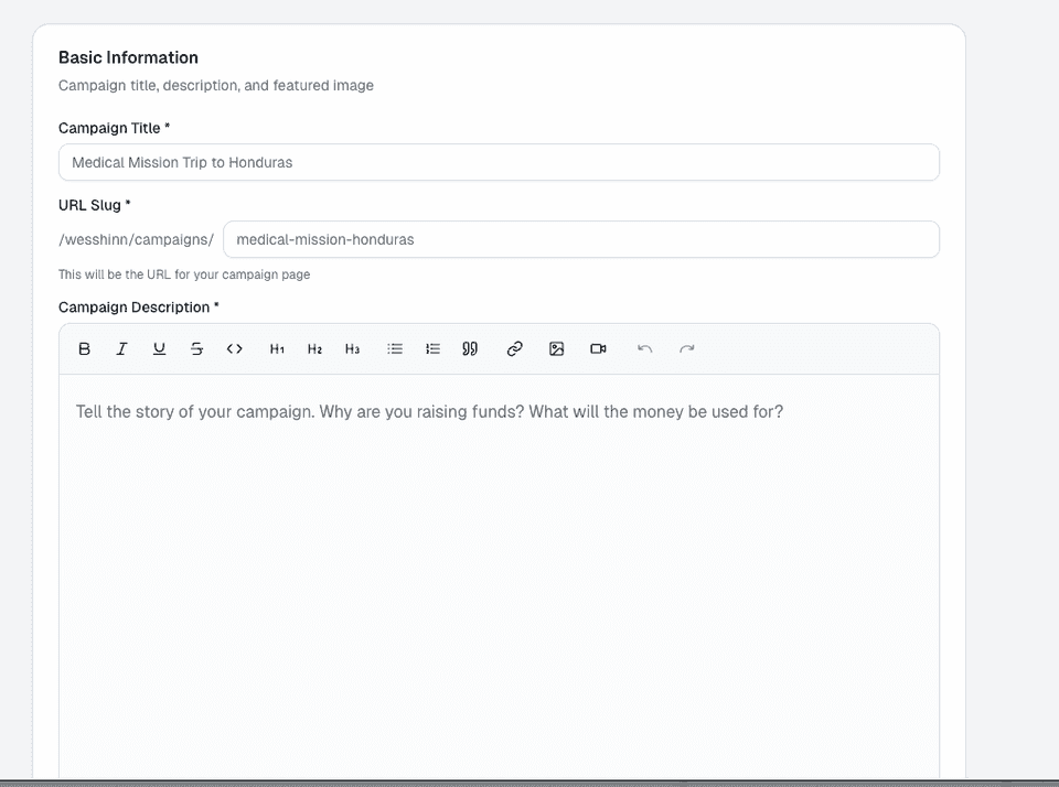 You will need to enter the title , campaign description and insert a featured image for the campaign.