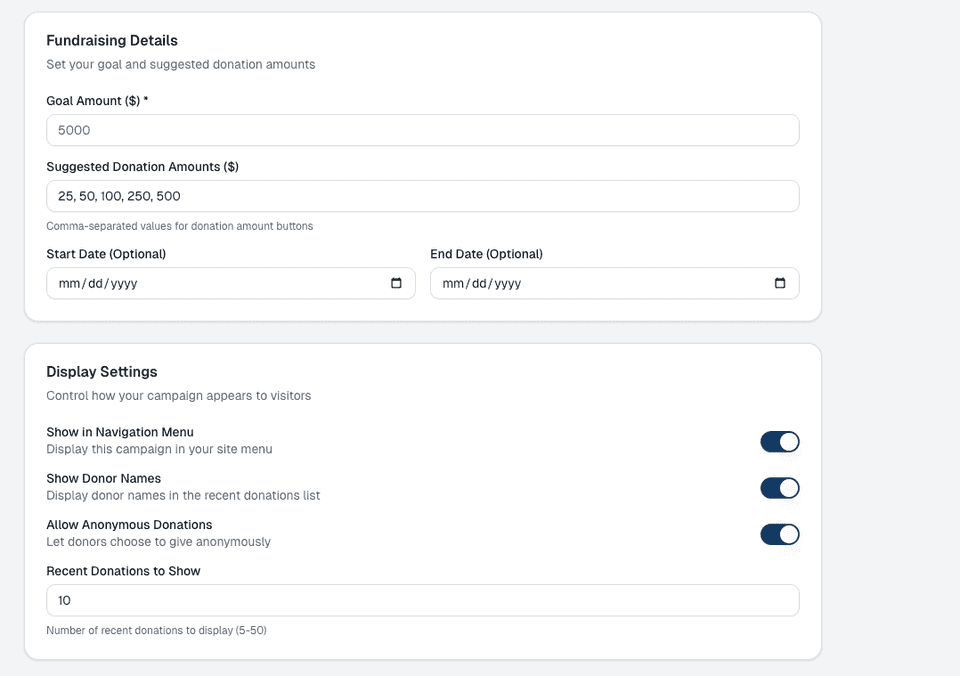 Further down the page you can set the targeted goal amount, donation amounts and an end date.