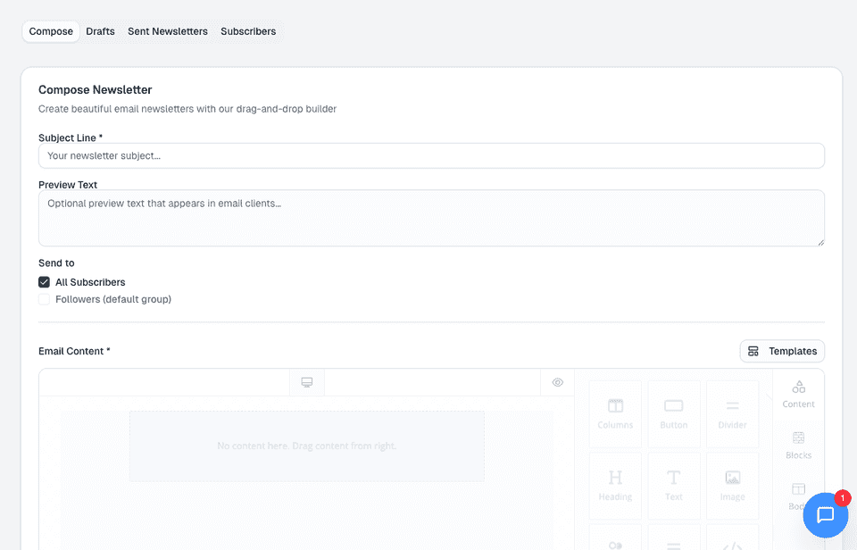 The newsletter page is designed to be drag-and-drop simple. You can start with one of our templates or design your own email from scratch.